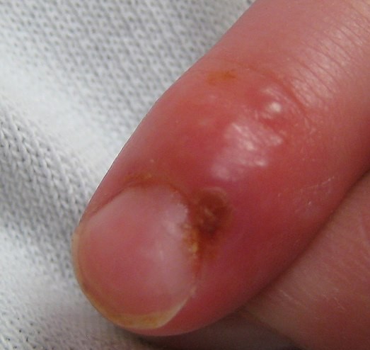 헤르페스 손발톱주위염이라고 하는데 손가락, 발가락에 발생한 헤르페스 감염으로 손가락을 빠는 어린 영유아에서 흔히 발생합니다.