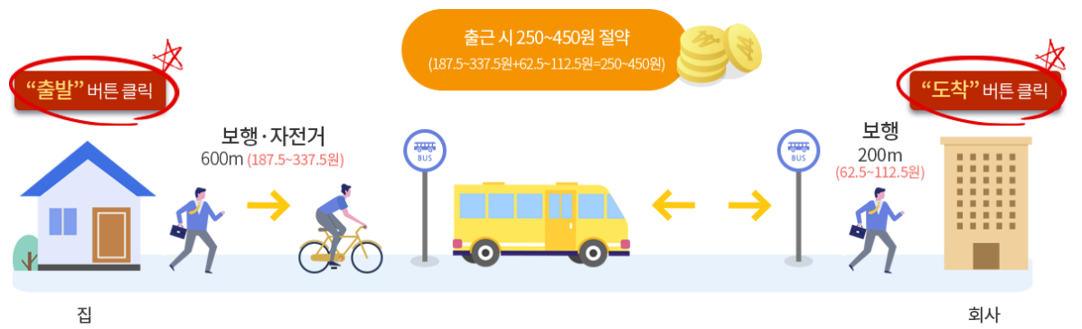 - 대중교통 이용과 연계한 보행/자전거 이용거리에 대한 마일리지 800m까지 250~450원 적립