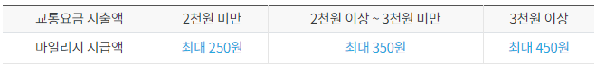 ※ 교통카드 이용내역은 실시간 전송되지 않으며, 최소 3일 ~ 8일(주말, 공휴일 포함) 소요됩니다. - 삼성페이, LG페이 등 타 모바일페이 이용시에는 마일리지가 적립되지 않습니다.