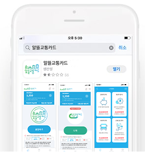 구글 플레이스토어, 앱스토어, 원스토어에서 '알뜰교통카드'를 검색 후 앱 다운로드 및 설치를 합니다.
