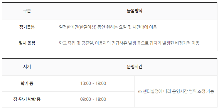 - 방과 후 돌봄이 필요한 초등학생이라면 누구나 이용할 수 있는 초등돌봄시설입니다.