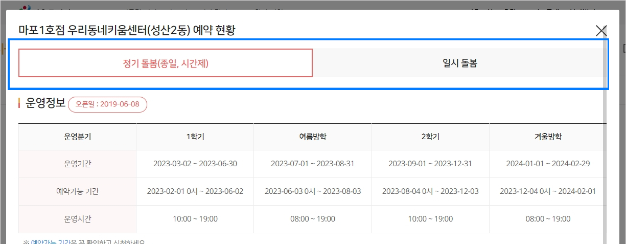 정기 돌봄(종일, 시간제)와 일시 돌봄 을 선택할 수 있습니다. 필요한 메뉴 클릭하세요.