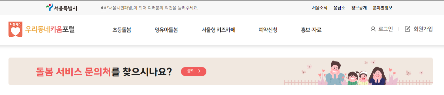 우리 동네 "지역아동센터" 찾기 1. 아래의 서울특별시 우리동네키움포털 사이트를 방문합니다. https://icare.seoul.go.kr/icare/index.do 서울시 우리동네키움포털 온마을 아이돌봄 서울시 우리동네키움센