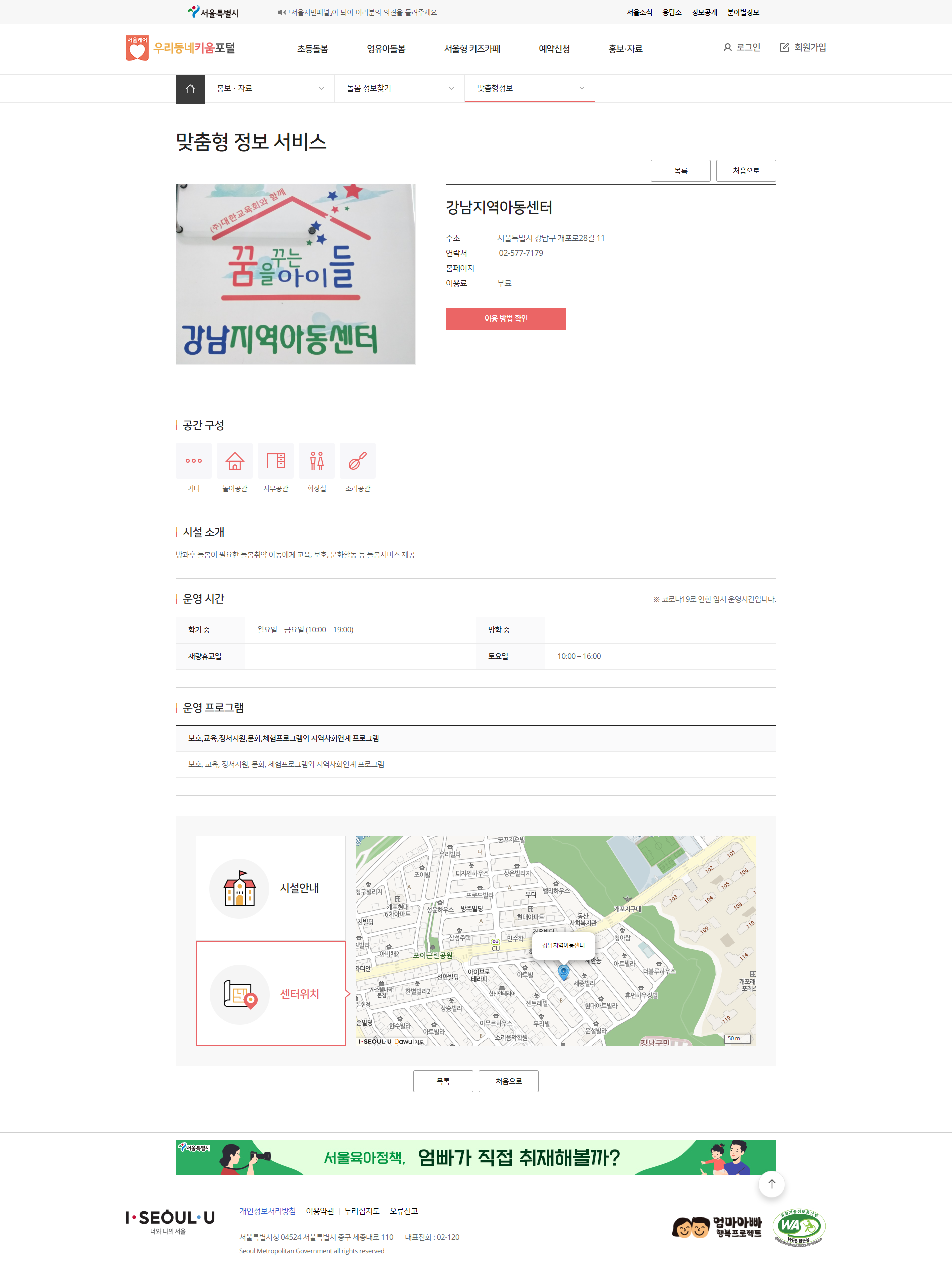 3. 아래의 화면처럼 센터정보가 보이며 검색한 자치구의 시설이 검색됩니다.