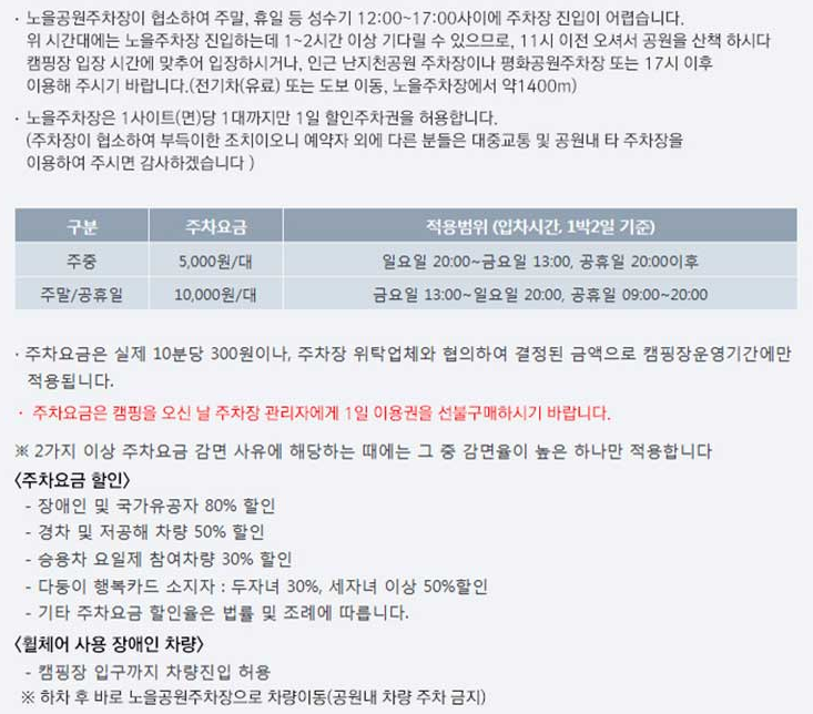 캠핑장 자체 주차장이 없으며, 별도로 운영되는 한강공원 공영주차장을 이용해야 합니다.