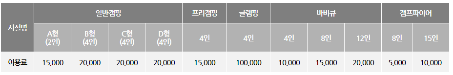 노을캠핑장 이용요금