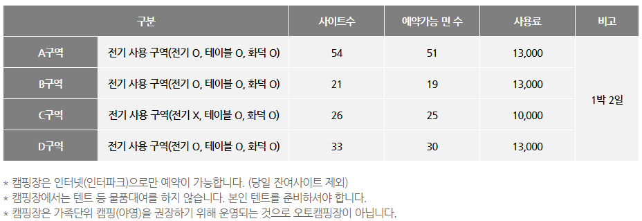 캠핑장도 유명한데 한 가지 단점은 전기시설을 사용할 수 있는 자리가 적습니다.