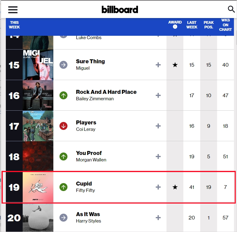 피프티 피프티 "큐피트" 빌보드 핫 100 순위