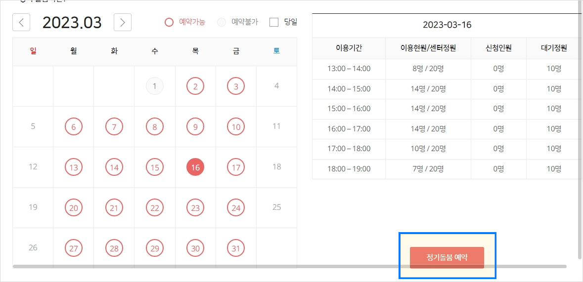 5. 각 월별로 센터 정원과 이용 현원, 대기 정원 등을 확인 후에 하단의 [정기 돌봄 예약] 신청해 주세요